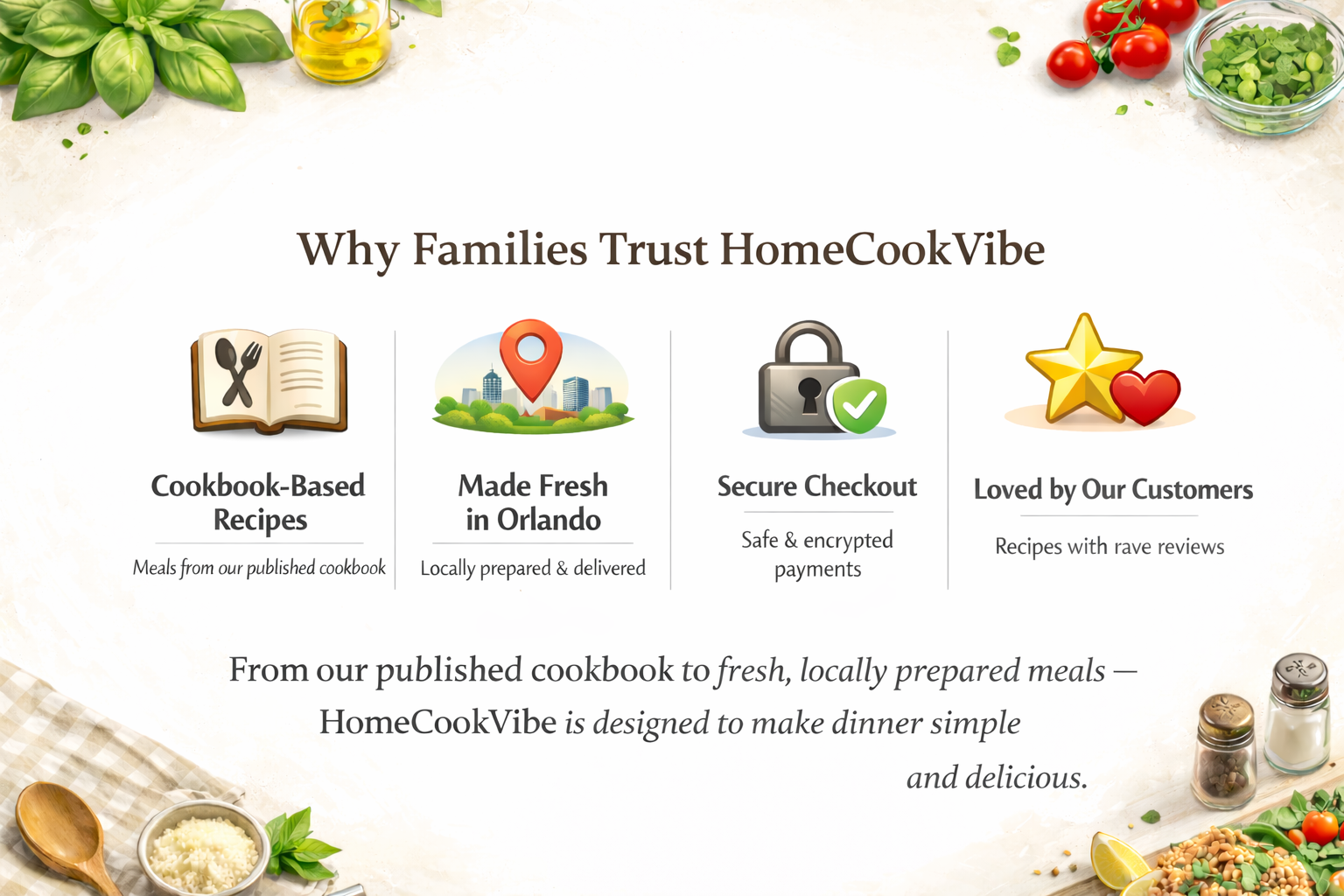 The HomeCookVibe Dinner System is your weekly solution for stress-free, great tasting dinners. Whether we deliver them ready to eat in Orlando or you cook them using our proven meal plan.